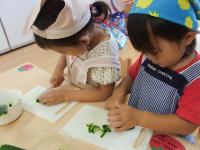 エプロンをつけて、手を洗ってと身支度も上手になってきました。 今日は夏野菜“きゅうり”がテーマ。 仲良しになる為に五感を使って 触ったり、匂いをかいだり、 ガブッとかじりついたり・・・ 塩をつけて板ずりも体験! |