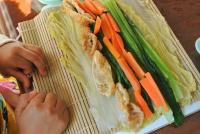 まず、白菜の葉を1人4枚ずつ 丁寧にはがして洗いました。 まきすの上には 油揚げ、小松菜、人参を お行儀よく並べて巻いたよ! |
