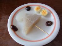 大根、こんにゃく、うずらの玉子。 大根とこんにゃくは格子状に 飾り切りをして うずらの玉子は 破れないように そっとむいて 串にさしました。 真ん中に串をさすのも難しいよね! |