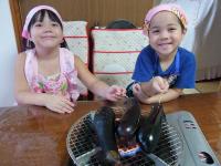 なすを焼くのはみんな初めて! もちろん、皮をむくのも初めて! 「火の粉があがったよ!」 「なすからお水がでてきたよ!」と みんないい目でよく観察できました。 |