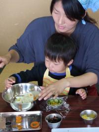 じゃが芋の皮を2歳、3歳のお友達が時間をかけてむきました。 途中で「できない!」とあきらめてしまったり、 飽きてしまったりといろいろですが、 お母さんの「ほら、上手にむけたよ!」 「ここもやってみて!」の声に励まさながらがんばりました。 味付けにも挑戦しました。 |