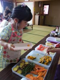 2、3歳のお友達でも切りやすいようにゆでたり、蒸したりして準備した彩り豊かなお野菜達。 2〜3種類ずつ選んでバターナイフで切ります。 「いろんな色があった方がおいしそうだよ〜」と声をかけながら結局全部入れるようにします。 今日で親子クッキングは最後。集合写真をパチリ! |