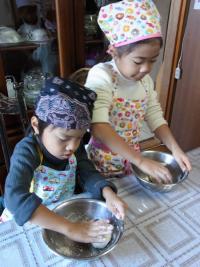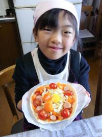 まず、強力粉と薄力粉の色、匂い、手触りの違いを比べました。 牛乳を入れてコネコネした後は・・・ 玉ねぎ、ウィンナー、赤パプリカ、黄パプリカ、トマトなどをトッピング! 小さいお友達はパプリカを星やハート、クマの形で抜きました。 飾り付けが終わるとにっこり! |