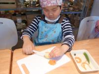 スパゲッティを作っています! 「ピーマンは細く切ってね!」と話すと こんなに真剣な表情で こんなに細く切る事ができました。 みんな、年中さんです。すごい! 包丁、正しく持っているでしょ。 詳細は楽しく作ろう!を見てね。 |