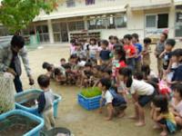 持って来て下さった昨年収穫した稲穂から一粒ずつもみを取ってお米が入っているのか確かめます。 外だったので出てきたお米をみんな「白い!白い!」と言っていましたがでてきたのは薄茶色の玄米です。 |