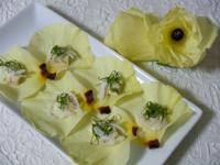 花を食べる“花オクラ” 実のオクラは食べられないそうです。 黄色い花びらがあんまりきれいなので こんな風に盛りつけて見ました。 一口サイズに切って醤油とごま油でマリネした豆腐に 刻んだ玉ねぎと大場をのせて・・ 花びらで包んで食べます。 |