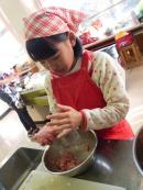 今回は煮込みハンバーグです。みんなウキウキ!まずは玉ねぎをみじん切りにしてひき肉をこねました。